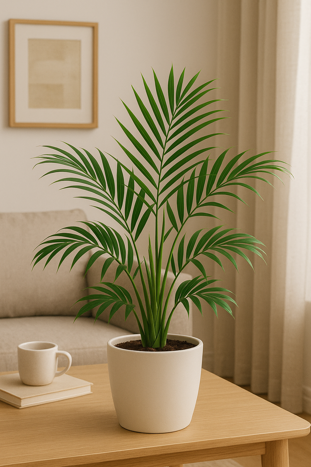 Tropical palm with feathery fronds. Creates a lush, airy vibe indoors.